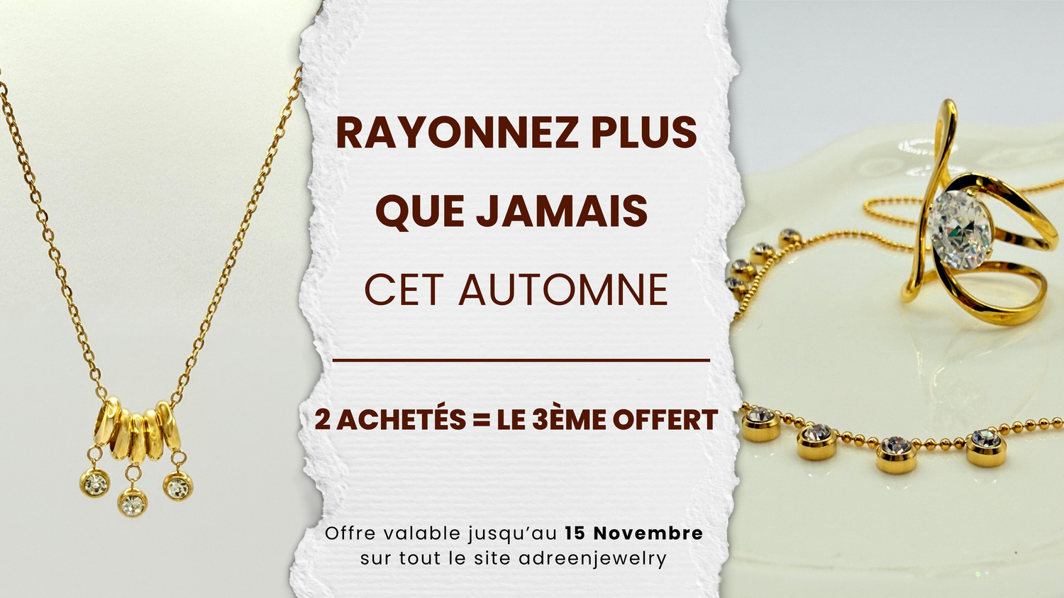 Chez ADREEN, nous croyons que chaque femme mérite de briller, jour après jour, avec élégance et confiance. Nos bijoux sont bien plus que de simples accessoires : ils sont le reflet de votre personnalité et de votre éclat intérieur.
