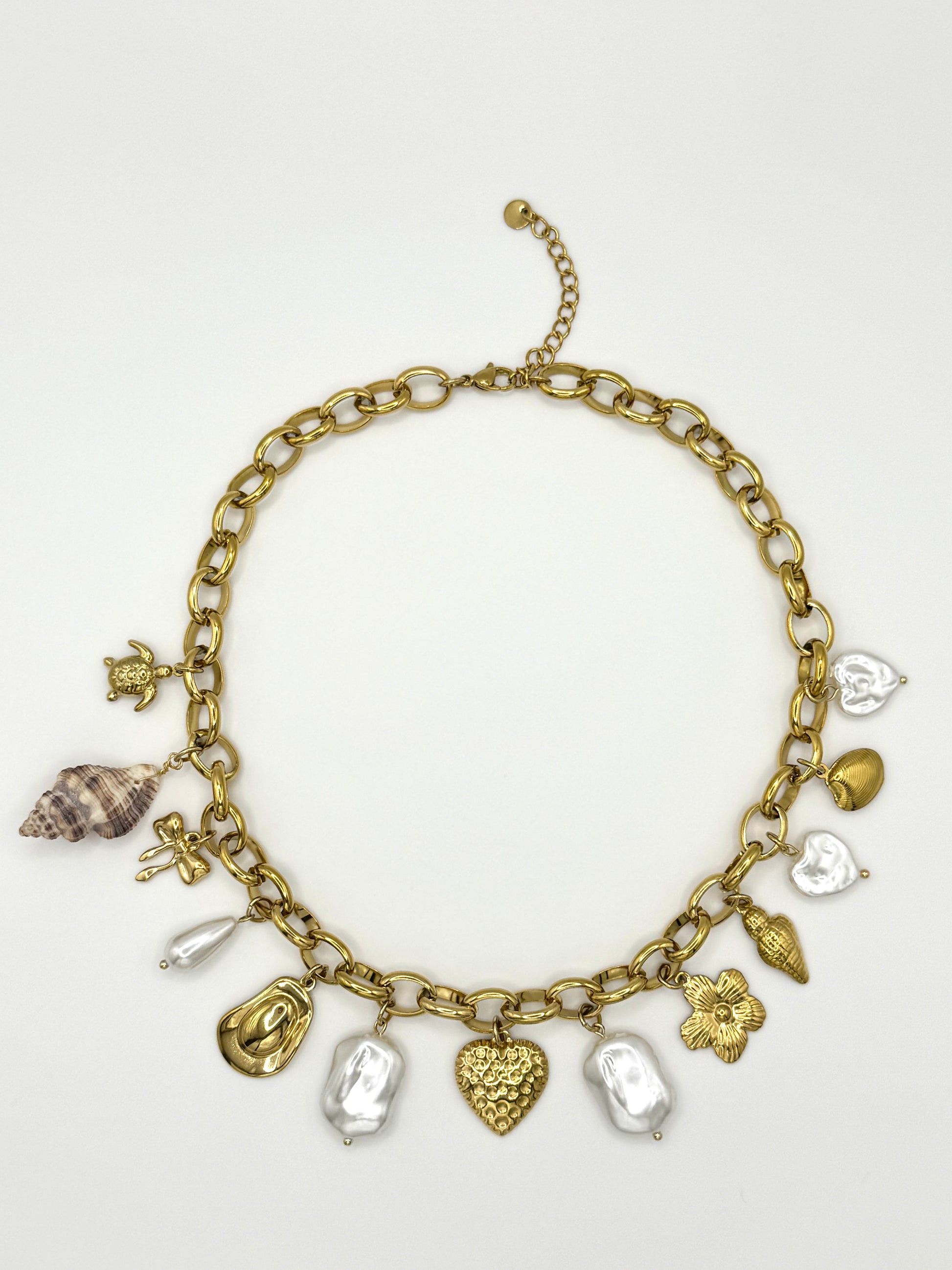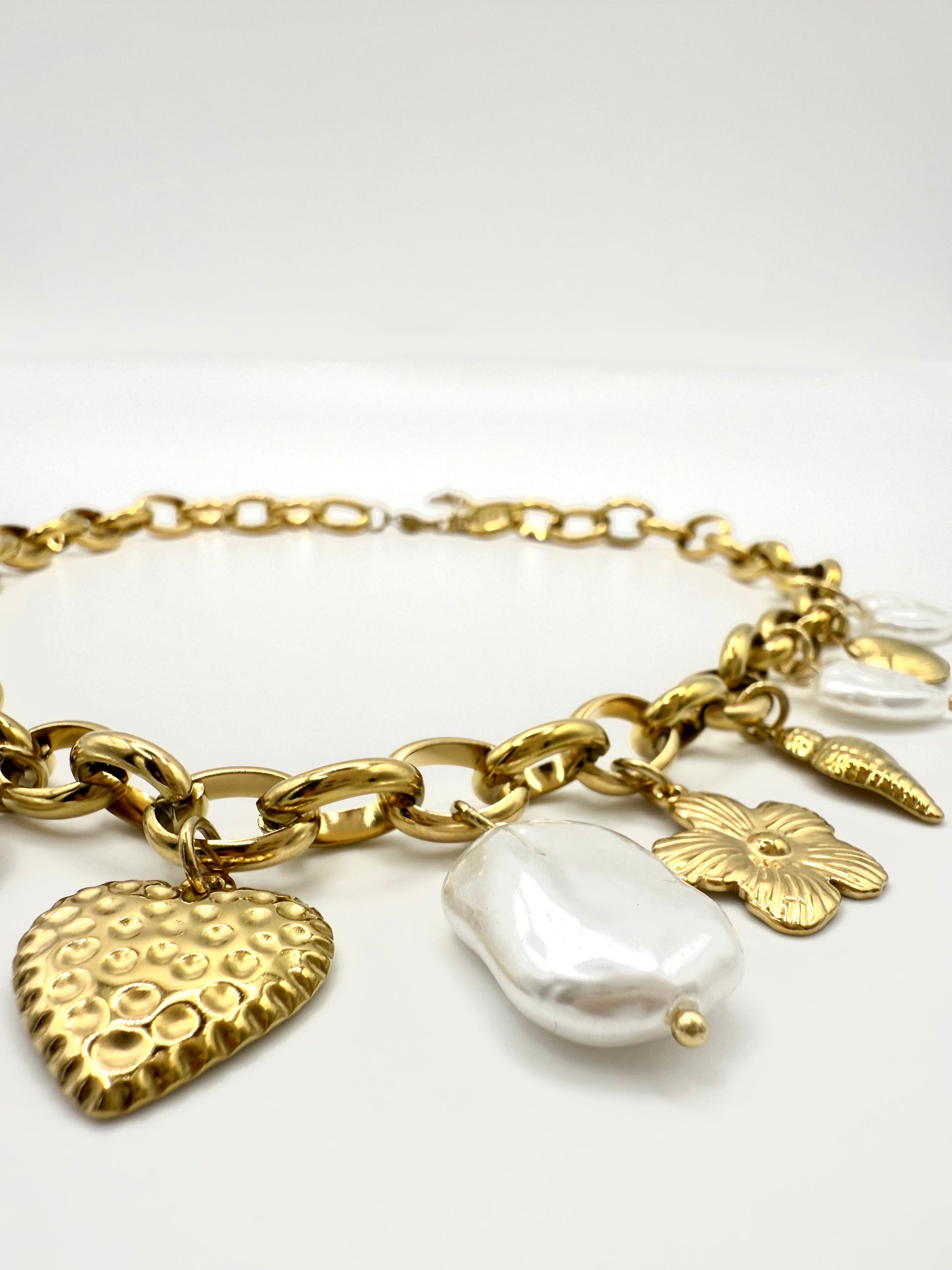 Ses maillons forts et dorés, ornés de pendentifs raffinés mêlant perles nacrées, cœurs texturés, fleurs et symboles précieux, en font un bijou unique qui attire les regards.