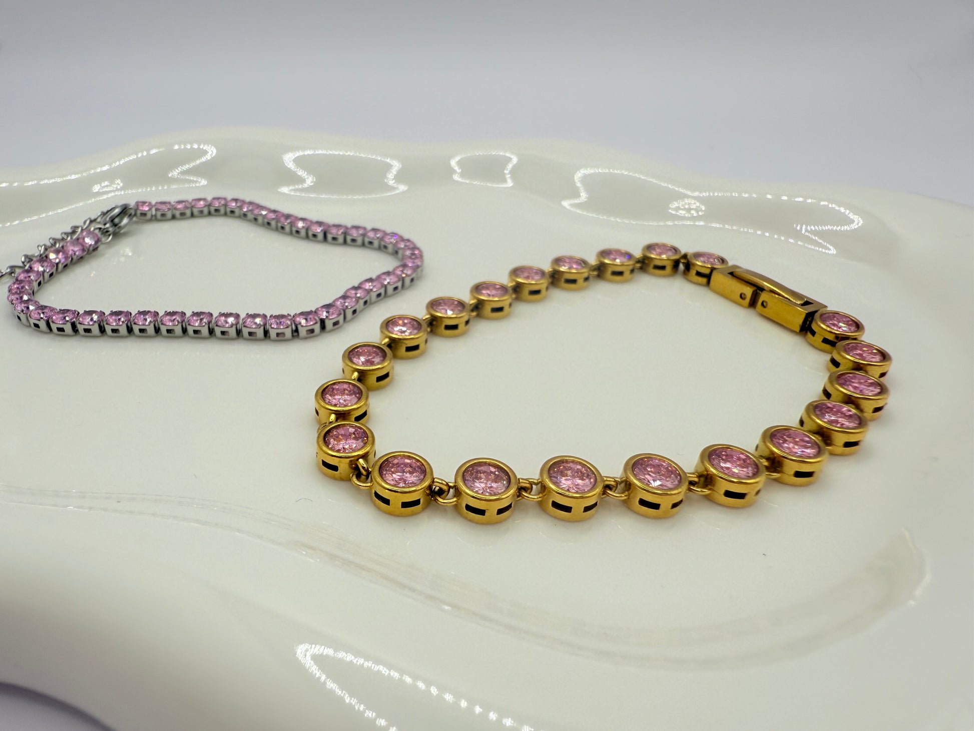 Ses zircons roses étincelants, sertis sur une base en acier inoxydable argentée, captent la lumière avec élégance pour révéler toute la beauté et la confiance de celle qui le porte.