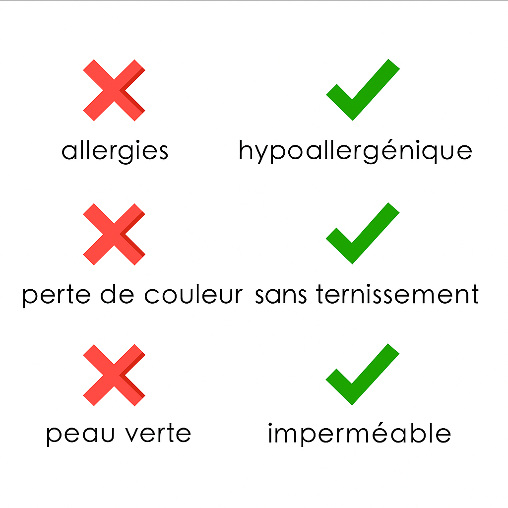 - Résistant à l’eau, à la transpiration et à la chaleur (sans décoloration, sans ternissement).